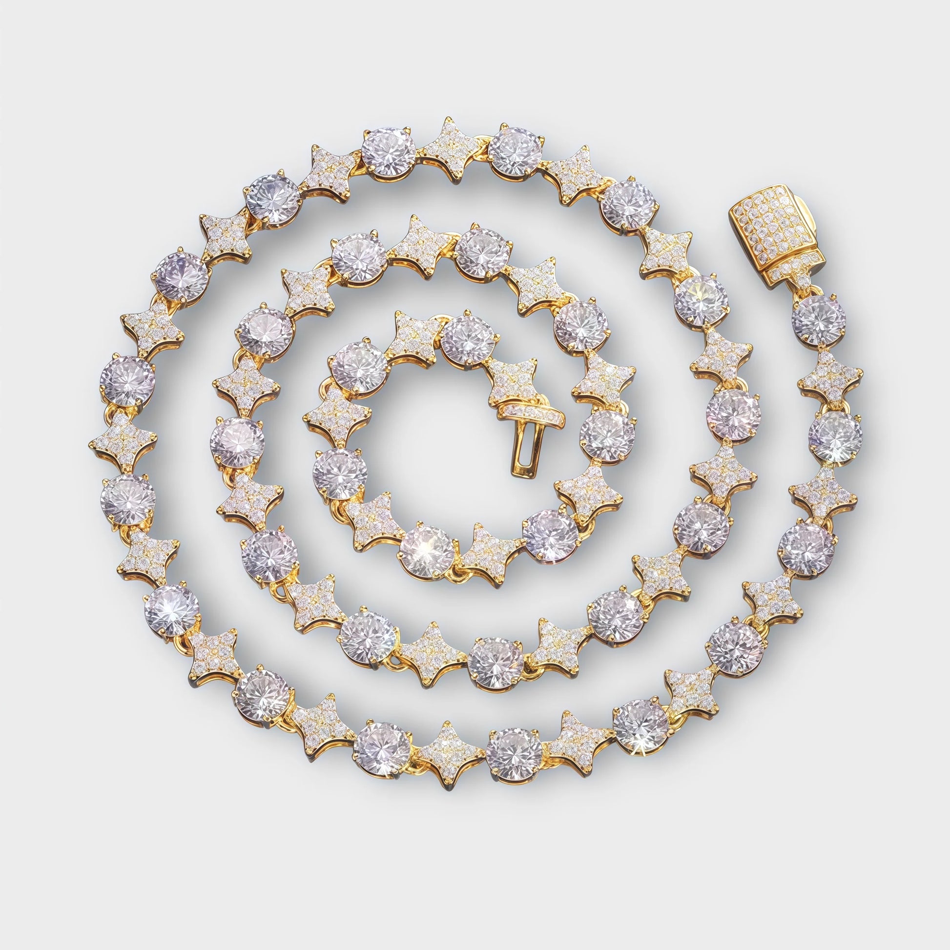 Turn your shine up a notch with our Stud x Star Moissanite Chain, a perfect fusion of luxury and artistry. Each link alternates between dazzling round-cut moissanite stones and uniquely designed star-shaped settings, creating a look that captures light, and attention, from every angle.